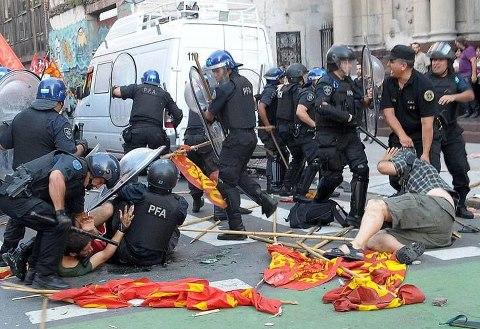 Por lo que leo la policía solo "desaloja" pero no arresta por daños, por ejemplo... esa filosofía de "no reprimir la protesta social" que implantó el gobierno es contraria a cualquier doctrina penal. La represión es totalmente válida en caso de delitos flagrante, no se porque lo tratan de dar carácter negativo a algo que simplemente es combatir el delito.